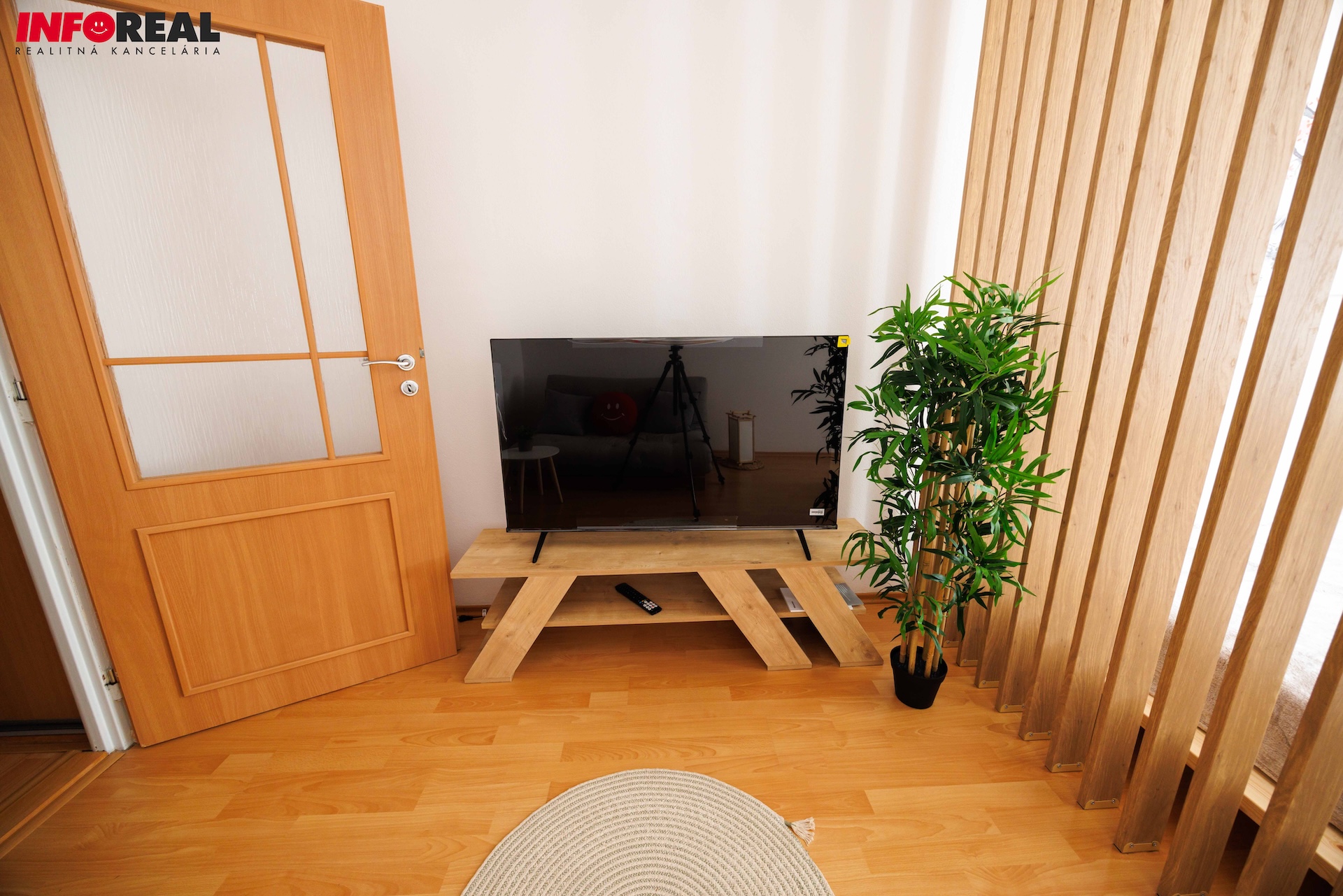 - Obývačka so spacím kútom: rozkladacia sedačka, TV stolík, TV, lamelová stena, manželská posteľ s matracom