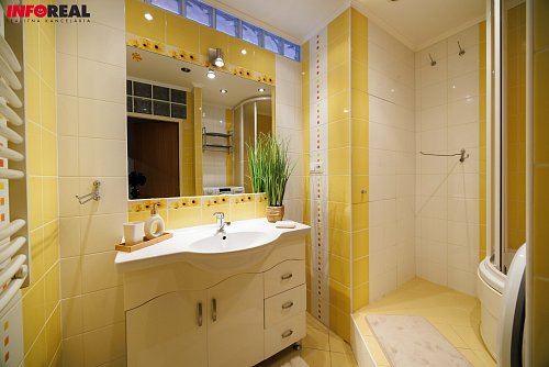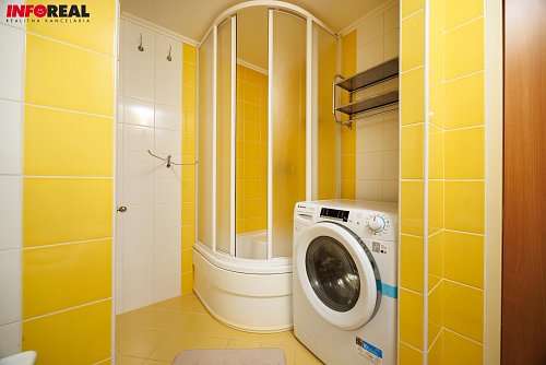 - Kúpeľňa a samostatné WC: sprchovací kút 90x90, umývadlo so skrinkou, práčka, elektrický radiátor pre uteráky.